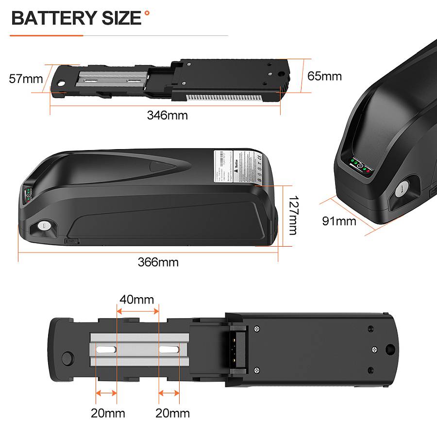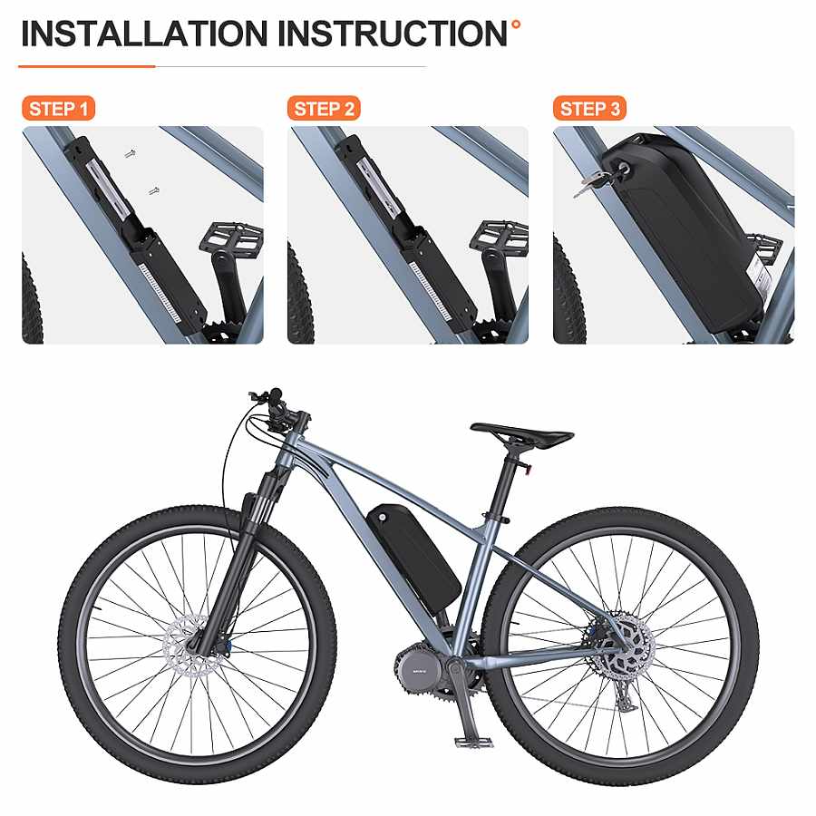 Bateria montowana jest na ramę poprzez płytę montażową, zamontowana jest do ramy poprzez otwory bidonowe w ramie roweru. Bateria wyposażona jest w zamek który zabezpiecza baterię przed kradzieżą.