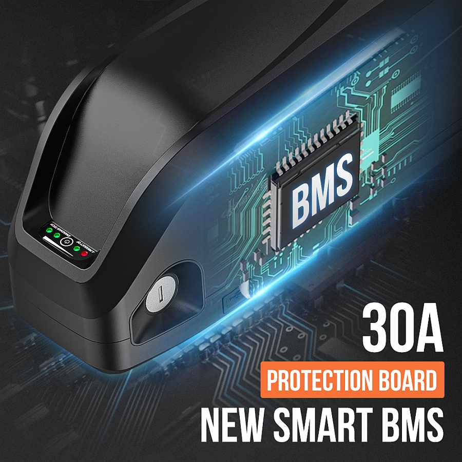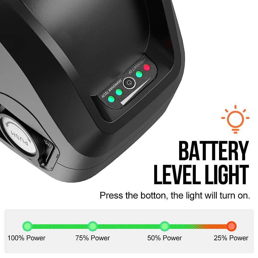 Bateria wyposażona jest również wyposażony w inteligentny system BMS, który chroni akumulator przed przeładowaniem, nadmiernym rozładowaniem, zwarciem i przegrzaniem oraz wydłuża jego żywotność. Na zewnętrznej obudowie posiada wskaźnik LED, który pokazuje pozostały poziom naładowania akumulatora w czterech etapach.