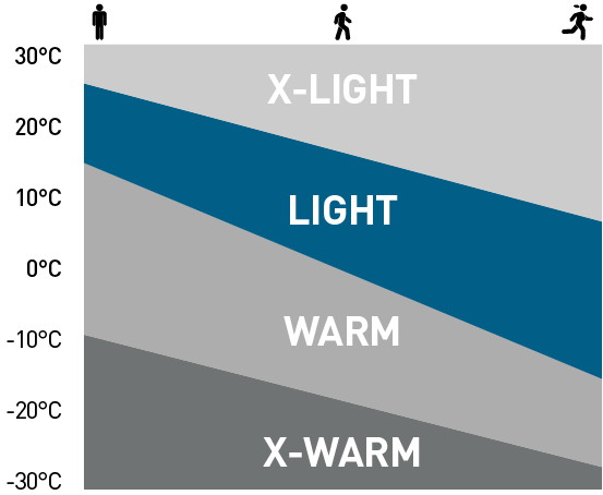Zgodnie z wykresem Systemu Kontroli Temperatury ODLO, akcesoria z grupy LIGHT najlepiej sprawdza się w temperaturach od ok. +25 st. C [niska aktywność] do ok. -15 st. C [wysoka aktywność fizyczna].